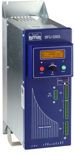 The most versatile of the BMR frequency converter – the power solution for all kinds of spindles Variable DC-link-voltage for optimum spindle voltage, thereby the best spindle control and running characterstics and lowest possible spindle temperature rise. In most cases, sinusoidale filters or output chokes are not necessary, also low-voltage spindles can be operated without any problems Galvanic isolation of the I/Os from the mains and spindle connections Integrated brake chopper resistor 200 W Automatic spindle braking when mains power off during operation Pulse blocking, optional as safe torque off Available as control cabinet version (SSE) with optional operating panel, also as desk-top unit or 19"-version
