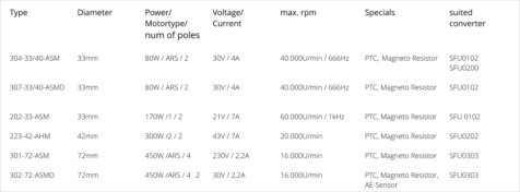 Type Diameter Power/ Voltage/ max. rpm Specials suited Motortype/ Current converter num of poles 304-33/40-ASM 33mm 80W / ARS / 2 30V / 4A 40.000U/min / 666Hz PTC, Magneto Resistor 307-33/40-ASMD 33mm 80W / ARS / 2 30V / 4A 40.000U/min / 666Hz PTC, Magneto Resistor 202-33-ASM 33mm 170W /1 / 2 21V / 7A 60.000U/min / 1kHz PTC, Magneto Resistor 223-42-AHM 42mm 300W /2 / 2 43V / 7A 20.000U/min PTC, Magneto Resistor 301-72-ASM 72mm 450W /ARS / 4 230V / 2,2A 16.000U/min PTC, Magneto Resistor 302-72-ASMD 72mm 450W /ARS / 4 2 230V / 2,2A 16.000U/min PTC, Magneto Resistor, AE-Sensor