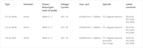 Type Diameter Power/ Voltage/ max. rpm Specials suited Motortype/ Current converter num of poles 217-42-MHM 42mm 300W /2 / 2 43V / 7A 60.000U/min / 1,000kHz PTC, Magneto Resistor 222-42-MHM 42mm 300W /2 / 2 43V / 7A 60.000U/min / 1,000kHz PTC, Magneto Resistor 218-42-MHP 42mm 300W /2 / 2 43V / 7A 60.000U/min / 1,000kHz PTC, Magneto Resistor, pneumatic tool change