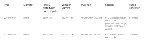Type Diameter Power/ Voltage/ max. rpm Specials suited Motortype/ Current converter num of poles 232-80-MHP 80mm 2,6kW /3 / 4 182V / 11,5A 40.000U/min / 1333Hz PTC, Magneto Resistor, water cooled, pneumatic tool change, inductive tool change control 227-80-MHM 80mm 2,6kW /3 / 4 182V / 11,5A 40.000U/min 1333Hz PTC, Magneto Resistor, water cooled